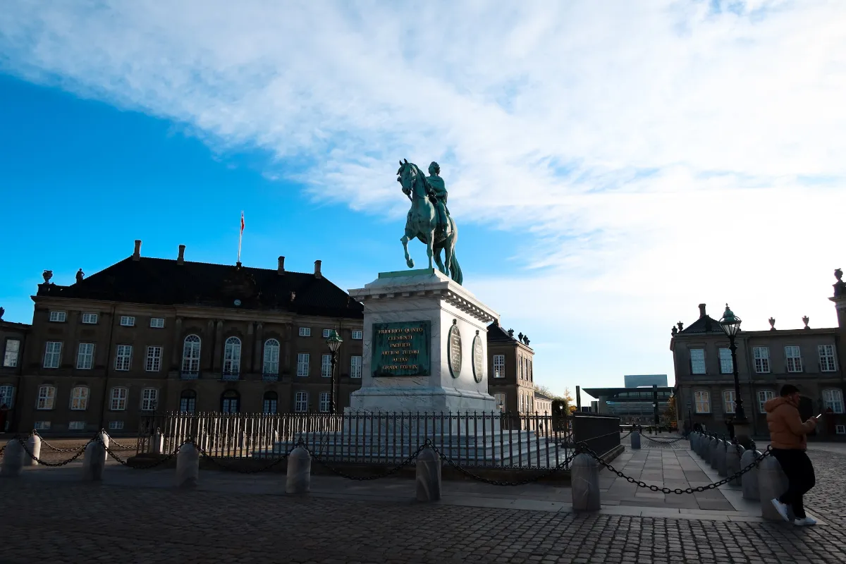 中央に立つフレゼリク5世の騎馬像のそばに立つと、四方を宮殿に囲まれた壮観な景色を楽しむことができます。